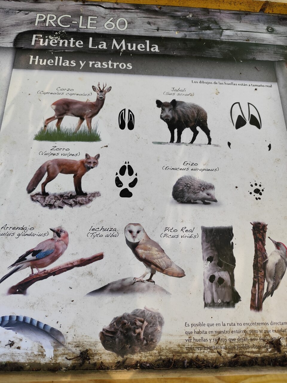 Unes tanques conviden a endinsar-se al bosc i assenyalen el camí a seguir. La ruta transcorre en aquest primer tram sobre una pista ampla que ascendeix suaument la muntanya. Aviat s’arriba a la Fuente de la Muela, un espai emblemàtic d’esbarjo enmig de la natura que és aprofitat tant pels propis saberencs com pels foranis. A l’entrada del recinte, un cartell informa de la fauna de l’indret.